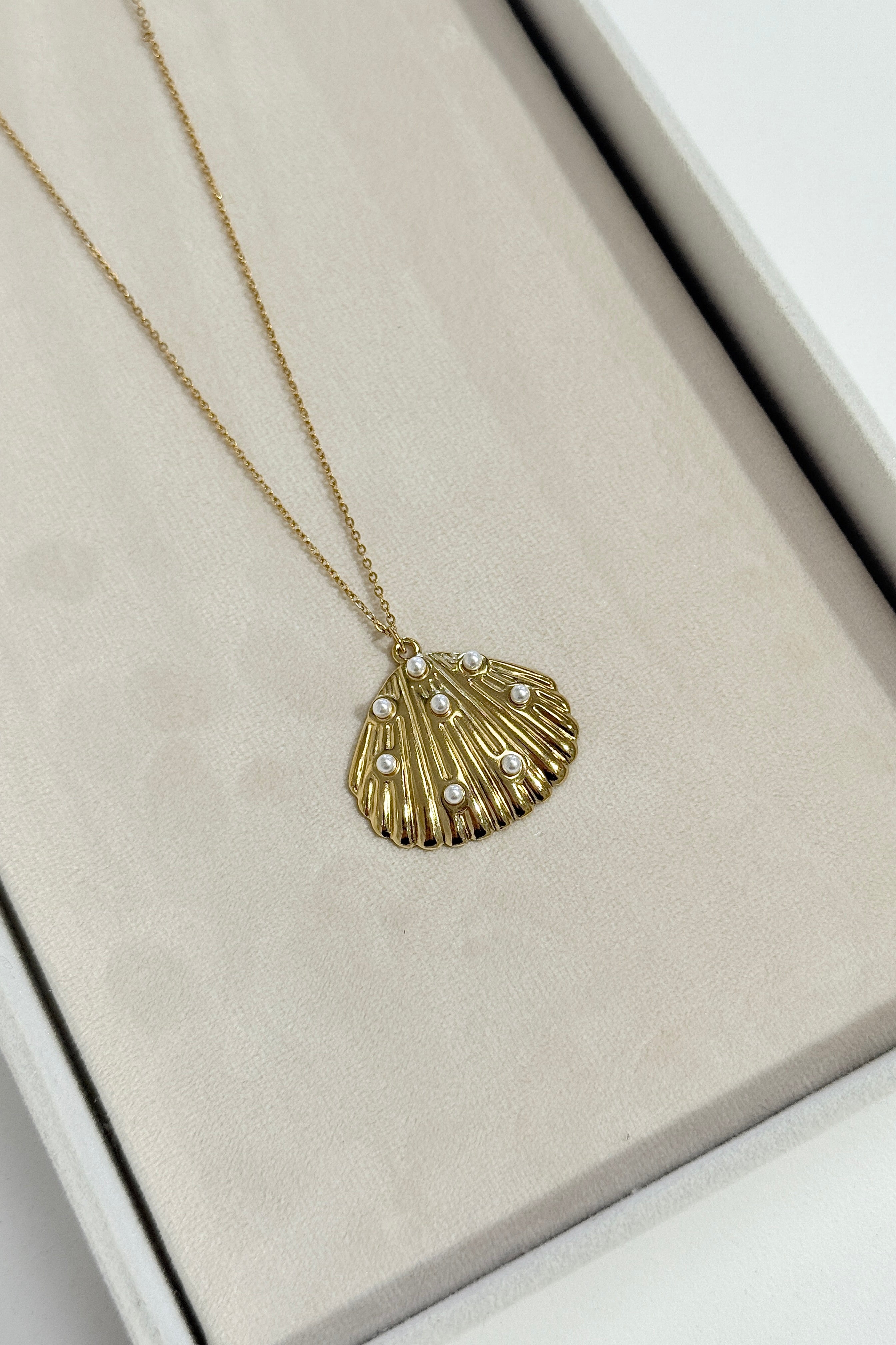 Indulge in the elegance of our Scallop Necklace in luxurious gold. Adorned with a textured pendant and shimmering imitation pearls, this PVD plated necklace is the perfect coastal charm. Enhance your look with this sophisticated and exclusive accessory.