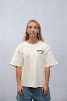 This women’s tee is made from 100% cotton with a relaxed, slightly oversized shape. Designed with a drop shoulder and mid-length cut, it sits similar to a unisex tee but with a shorter fit for an easy, everyday look.