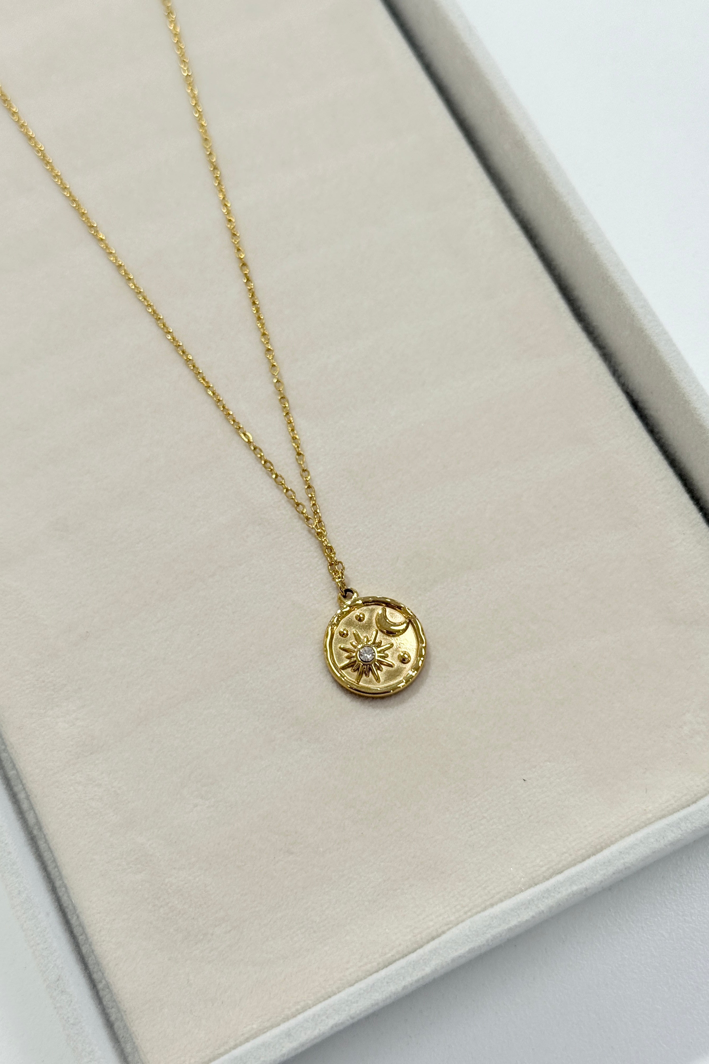 This waterproof 18K gold-plated stainless steel necklace shines with a fun geometric sun and star pendant. Designed to resist tarnish and built with sturdy stainless steel and bezel setting, itβs your go-to accessory for adding a playful sparkle to any outfit every day.
